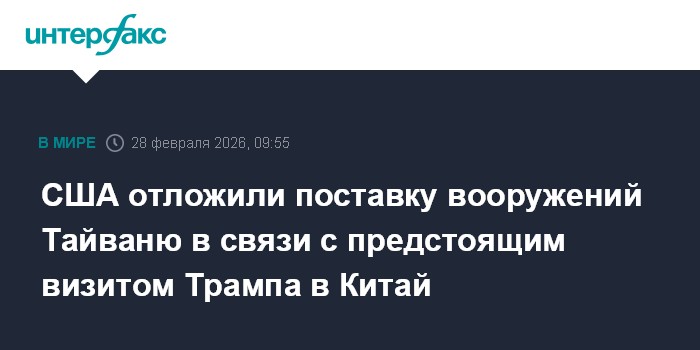 Администрация США отложила реализацию сделки по продаже вооружений Тайваню на сумму $13 млрд, чтобы не омрачать предстоящий визит резидента США Дональда Трампа в Китай, сообщает The New York Times (NYT)."Администрация Трампа отложила объявление о пакете продажи вооружений Тайваню стоимостью в миллиарды долларов, чтобы не расстраивать лидер Китая Си Цзиньпина перед запланированной поездкой президента Трампа в Пекин в апреле", - пишет издание со ссылкой на неназванных чиновников.