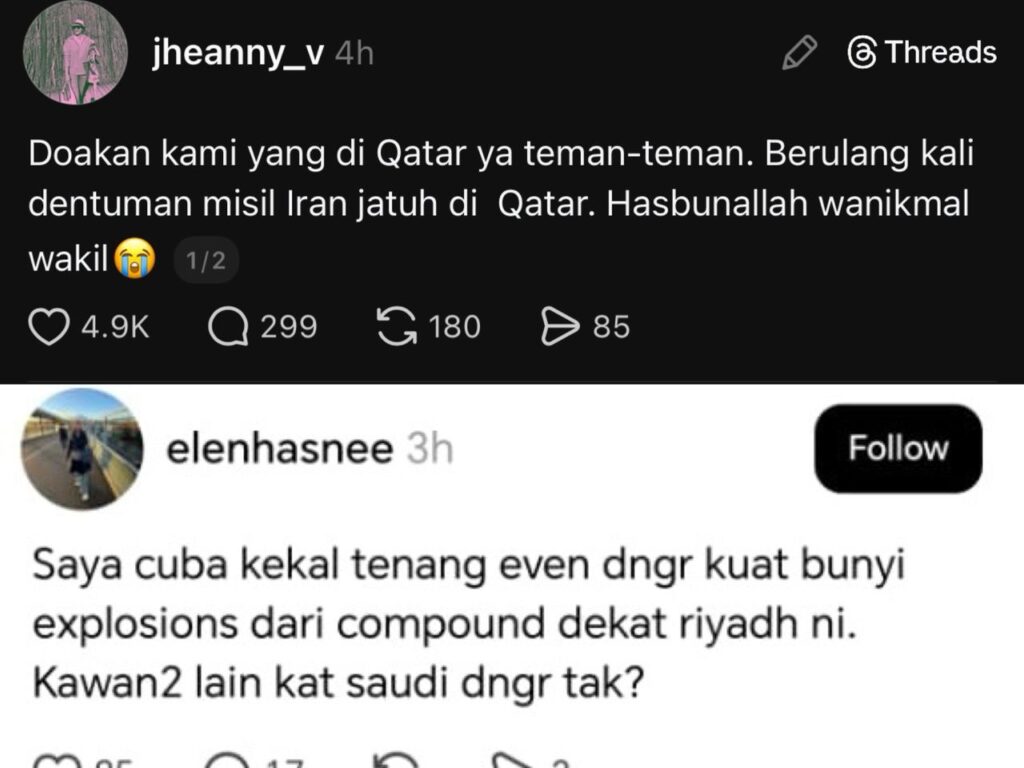 PETALING JAYA – Beberapa rakyat Malaysia yang berada di Arab Saudi dan Qatar berkongsi pengalaman mendebarkan apabila mendakwa terdengar bunyi letupan serta dentuman kuat susulan ketegangan memuncak antara Iran dan Israel. Menerusi hantaran tular di platform Threads, seorang wanita dipercayai berada di Riyadh mendakwa cuba kekal tenang walaupun mendengar bunyi letupan kuat berhampiran kawasan ... Read more The post Rakyat Malaysia di Riyadh, Qatar dengar dentuman, bunyi misil appeared first on Kosmo Digital .