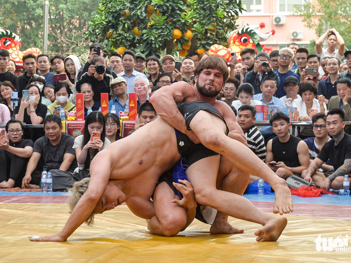 A Belarusian wrestler’s appearance at a traditional village festival in Hanoi drew large crowds and heightened excitement at the annual spring wrestling event, as local competitors took on the heavier foreign contender.