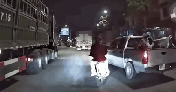 Bị chiếc xe bán tải "tạt đầu" bất ngờ, người điều khiển xe máy cùng người phụ nữ phía sau bế một trẻ em ngã xuống đường.