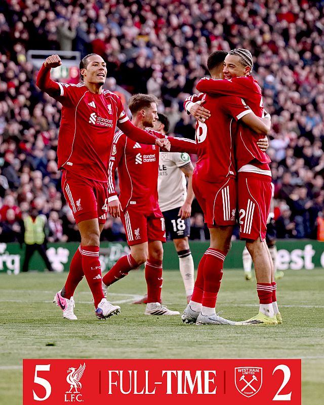 استغل ليفربول هشاشة دفاع وست هام يونايتد في الكرات الثابتة ليحقق فوزًا عريضًا بنتيجة 5-2، ضمن الجولة الثامنة والعشرين من الدوري الإنجليزي الممتاز لكرة القدم على ملعب أنفيلد. وافتتح المهاجم أوغو إيكيتيكي التسجيل مبكرًا في الدقيقة الخامسة، قبل أن يعزز القائد فيرجيل فان دايك النتيجة برأسية في الدقي