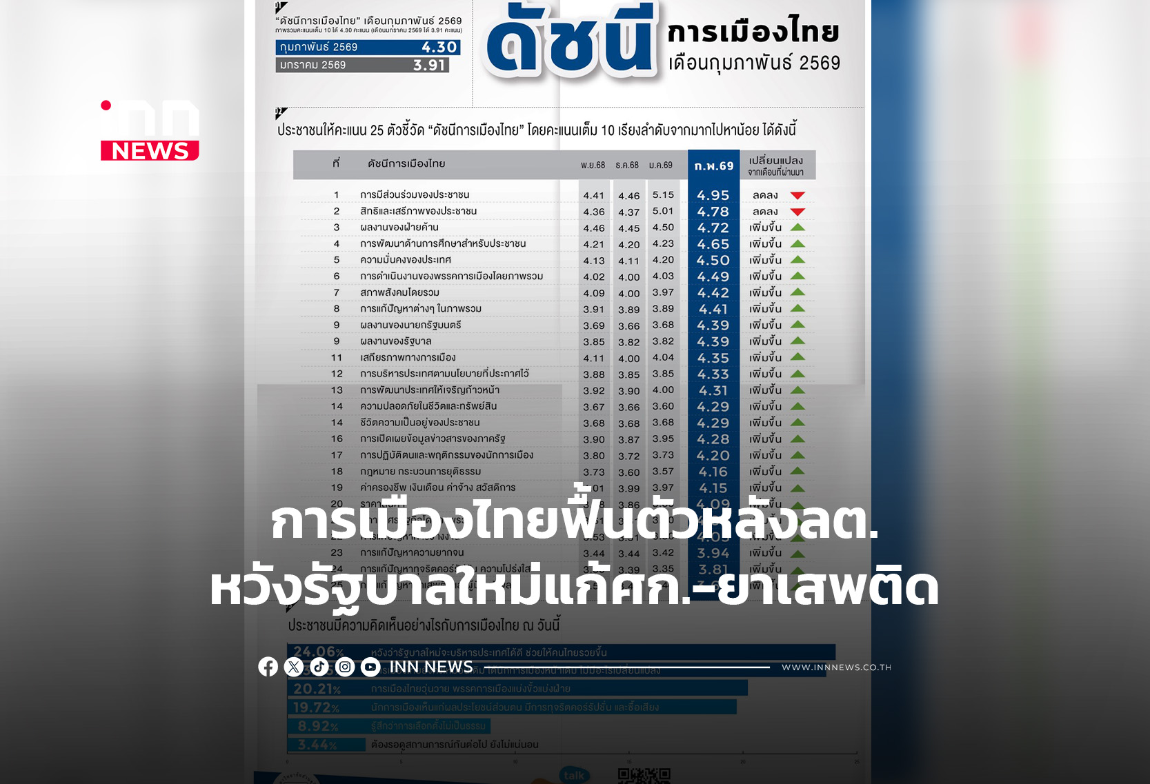 “สวนดุสิตโพล”เผยดัชนีการเมืองไทยฟื้นตัวหลังเลือกตั้ง คะแนนเพิ่มจาก 3.91 เป็น 4.30 คนไทยคาดหวังรัฐบาลใหม่ จี้แก้เศรษฐกิจ-ยาเสพติด