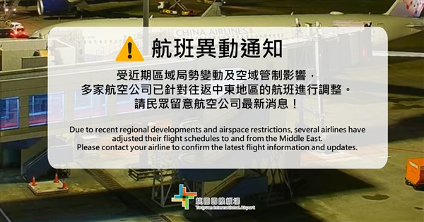 Taipei, March 1 (CNA) Six flights between Taiwan and the Middle East were canceled Sunday at Taiwan Taoyuan International Airport following airstrikes by the United States and Israel on Iran, and subsequent Iranian missile and drone attacks on Gulf states.