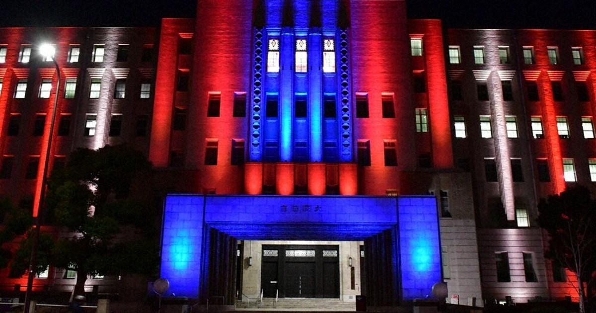 大阪府庁舎、100周年ライトアップ実施 点灯式にはミャクミャクも