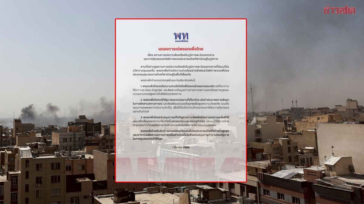 ‘เพื่อไทย’ ออกแถลงการณ์ จี้ ‘รัฐบาล’ ดำเนินการเชิงรุก รับมือวิกฤตตะวันออกกลาง วางแผนอพยพให้ชัด ย้ำ ความปลอดภัยประชาชนคือภารกิจสูงสุด เมื่อวันที่ 1 มี.ค. 2569 เพจเฟซบุ๊ก พรรคเพื่อไทย โพสต์แถลงการณ์เรื่อง สถานการณ์ความตึงเครียดในภูมิภาคตะวันออกกลาง และการคุ้มครองสวัสดิภาพของประชาชนไทยที่พำนักอยู่ในภูมิภาคว่า ตามที่ปรากฏสถานการณ์ความขัดแย้งในภูมิภาคตะวันออกกลางที่มีแนวโน้มทวีความรุนแรงขึ้น พรรคเพื่อไทยมีความห่วงใยอย่างยิ่งต่อสวัสดิภาพของพี่น้องประชาชน และแรงงานไทยที่พำนักอยู่ในพื้นที่เสี่ยงภัย พรรคเพื่อไทยขอแถลงจุดยืนและข้อเรียกร้องดังนี้ 1.พรรคเพื่อไทยขอส่งความห่วงใยไปยังพี่น้องคนไทยและครอบครัว ขอให้ทุกท่านใช้ความระมัดระวังสูงสุด และติดตามข้อมูลข่าวสารจากสถานเอกอัครราชทูตและหน่วยงานของรัฐอย่างใกล้ชิดในทุกช่องทาง 2.พรรคเพื่อไทยขอให้รัฐบาลและหน่วยงานที่เกี่ยวข้อง เร่งดำเนินมาตรการเชิงรุกในการติดตามสถานการณ์ และจัดเตรียมแผนเผชิญเหตุเพื่อดูแลความปลอดภัย รวมถึงแผนการอพยพหากมีความจำเป็น เพื่อให้มั่นใจว่าคนไทยทุกคนจะได้รับการคุ้มครองอย่างทันท่วงที 3.พรรคเพื่อไทยสนับสนุนการแก้ไขปัญหาความขัดแย้งด้วยการเจรจาและสันติวิธี เพื่อหลีกเลี่ยงผลกระทบที่จะเกิดขึ้นต่อพลเรือนและเศรษฐกิจโลก และขอให้รัฐบาลไทยรักษาบทบาทที่สมดุลในการประสานความช่วยเหลือภายใต้กรอบมนุษยธรรม พรรคเพื่อไทย ยืนยันว่า ความปลอดภัยของพี่น้องประชาชนไทยคือภารกิจสูงสุด และเราจะร่วมติดตามสถานการณ์นี้อย่างต่อเนื่องเพื่อสนับสนุนการทำงานของรัฐบาลในการดูแลคนไทยให้ดีที่สุด