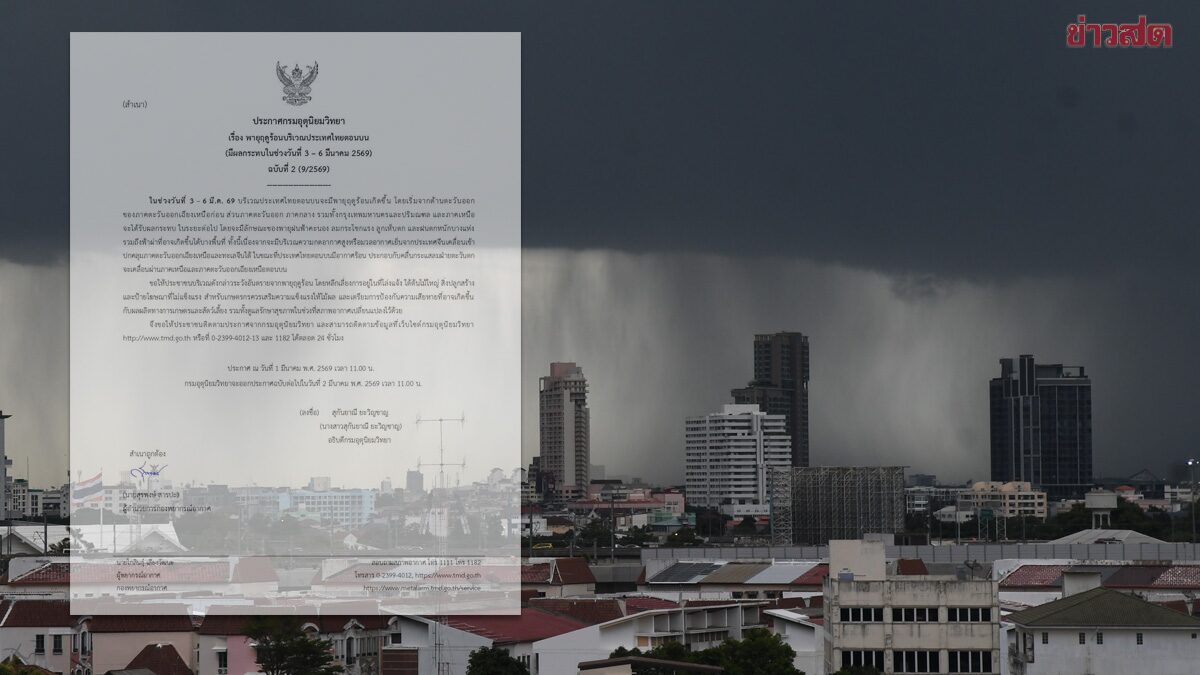 กรมอุตุฯ ประกาศฉบับที่ 2 เตือน พายุฤดูร้อน ถล่มไทยตอนบน วันที่ 3-6 มี.ค.นี้ ฝนกระหน่ำ ลมกระโชกแรง ลูกเห็บตก ฟ้าผ่า ฝนตกหนักบางแห่ง วันที่ 1 มี.ค.2569 กรมอุตุนิยมวิทยา พายุฤดูร้อนบริเวณประเทศไทยตอนบน (มีผลกระทบในช่วงวันที่ 3-6 มีนาคม 2569) ฉบับที่ 2 (9/2569) ระบุว่า ในช่วงวันที่ 3-6 มี.ค. 69 บริเวณประเทศไทยตอนบนจะมีพายุฤดูร้อนเกิดขึ้น โดยเริ่มจากด้านตะวันออกของภาคตะวันออกเฉียงเหนือก่อน ส่วนภาคตะวันออก ภาคกลาง รวมทั้งกรุงเทพมหานครและปริมณฑล และภาคเหนือจะได้รับผลกระทบ ในระยะต่อไป โดยจะมีลักษณะของพายุฝนฟ้าคะนอง ลมกระโชกแรง ลูกเห็บตก และฝนตกหนักบางแห่ง รวมถึงฟ้าผ่าที่อาจเกิดขึ้นได้บางพื้นที่ ทั้งนี้ เนื่องจากจะมีบริเวณความกดอากาศสูงหรือมวลอากาศเย็นจากประเทศจีนเคลื่อนเข้าปกคลุมภาคตะวันออกเฉียงเหนือและทะเลจีนใต้ ในขณะที่ประเทศไทยตอนบนมีอากาศร้อน ประกอบกับคลื่นกระแสลมฝ่ายตะวันตกจะเคลื่อนผ่านภาคเหนือและภาคตะวันออกเฉียงเหนือตอนบน ขอให้ประชาชนบริเวณดังกล่าวระวังอันตรายจากพายุฤดูร้อน โดยหลีกเลี่ยงการอยู่ในที่โล่งแจ้ง ใต้ต้นไม้ใหญ่ สิ่งปลูกสร้าง และป้ายโฆษณาที่ไม่แข็งแรง สำหรับเกษตรกรควรเสริมความแข็งแรงให้ไม้ผล และเตรียมการป้องกันความเสียหายที่อาจเกิดขึ้นกับผลผลิตทางการเกษตรและสัตว์เลี้ยง รวมทั้งดูแลรักษาสุขภาพในช่วงที่สภาพอากาศเปลี่ยนแปลงไว้ด้วย […]