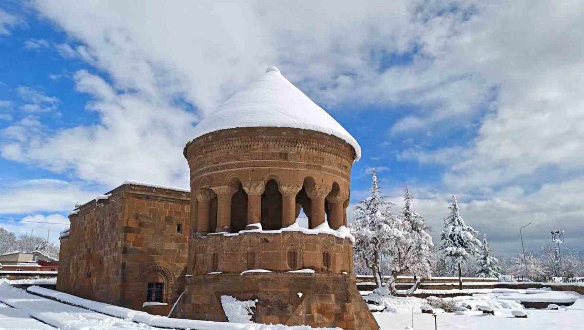 Bitlis'in Ahlat ilçesinde etkili olan kar yağışı sonrası tarihi mekânlar beyaza büründü, ortaya kartpostallık manzaralar çıktı.