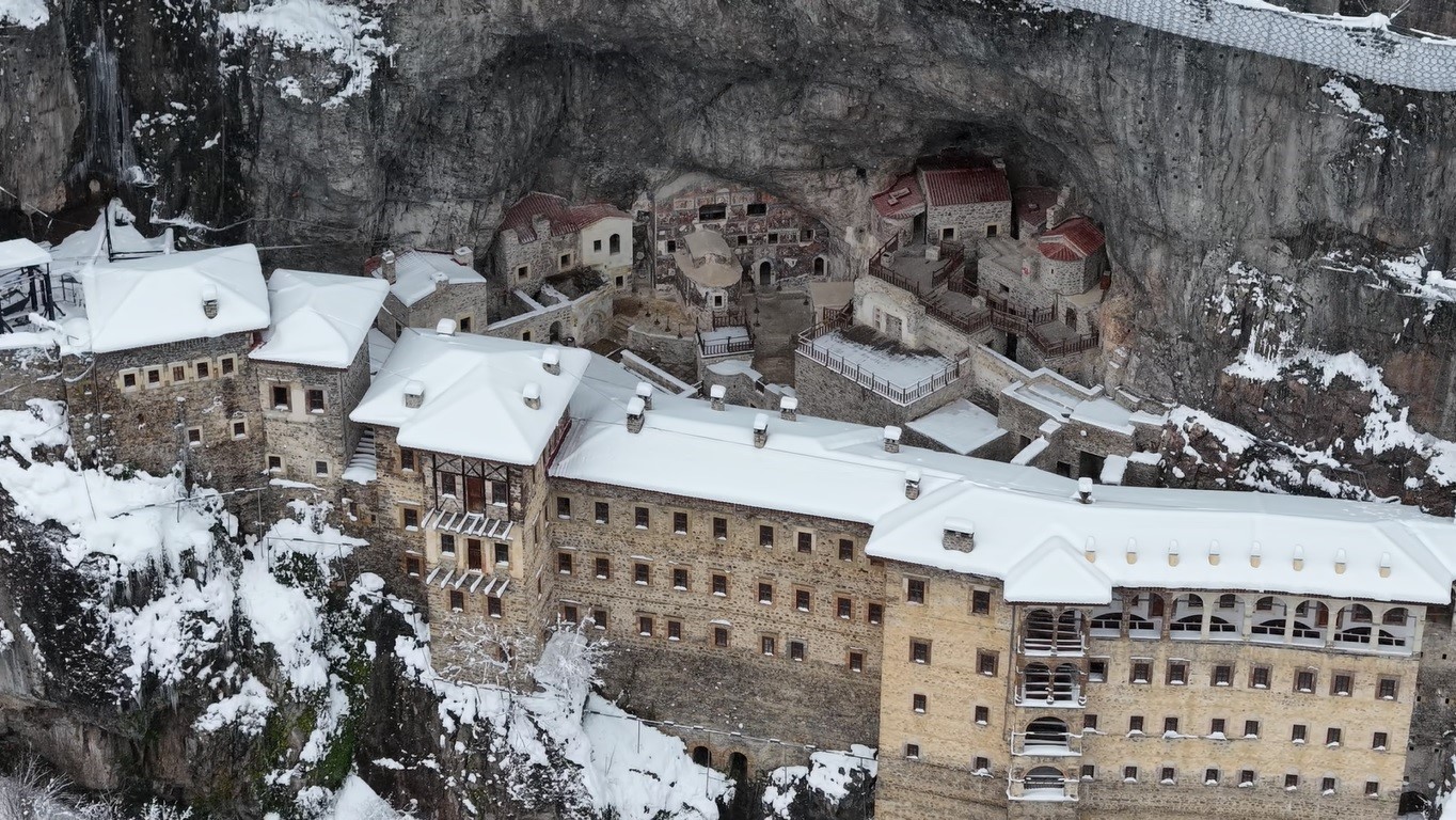 Türkiye'nin önemli yapılarından biri olan Sümela Manastırı kar yağışıyla beraber eşsiz görüntüleriyle gündeme geldi.