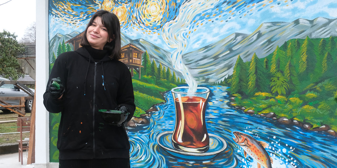 Rize’nin Pazar ilçesinde yaşayan Gamze Şehitoğlu (24), kentin kültürel simgelerini dünyaca ünlü ressam Vincent van Gogh’un ‘Yıldızlı Gece’ tablosundan esinlenerek bir fuar alanının duvarına resmetti.