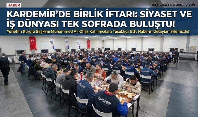 KARDEMİR A.Ş. tarafından merkez yemekhanede düzenlenen iftar programı, siyaset, iş dünyası ve sendika temsilcilerinin yoğun katılımıyla gerçekleştirildi. Ramazan’ın birlik ve beraberlik ruhunun vurgulandığı programda Yönetim Kurulu Başkanı Muhammed Ali Oflas, katılımcılara teşekkür etti. Program, iftarın ardından sona erdi.