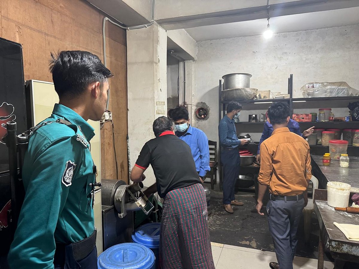 স্যাঁতসেঁতে রান্নাঘরে ভাঙা ও নোংরা টাইলস। খাবার রাখা হচ্ছিল নষ্ট ফ্রিজে। ফ্রিজের ভেতরে তেলাপোকার ছুটোছুটি। কর্মীরাও অনুসরণ করছিলেন না যথাযথ স্বাস্থ্যবিধি।