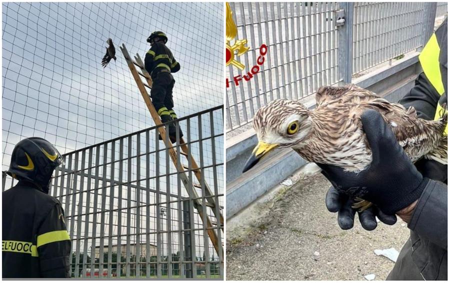 Monserrato, occhione rimane incastrato nella rete del campo da calcio: salvato dai vigili del fuoco