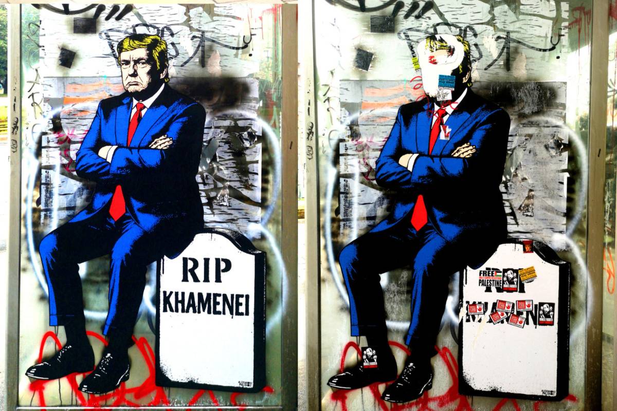L’opera dell’artista aleXsandro Palombo raffigurava The Donald seduto sulla lapide dell’ayatollah Ali Khamenei