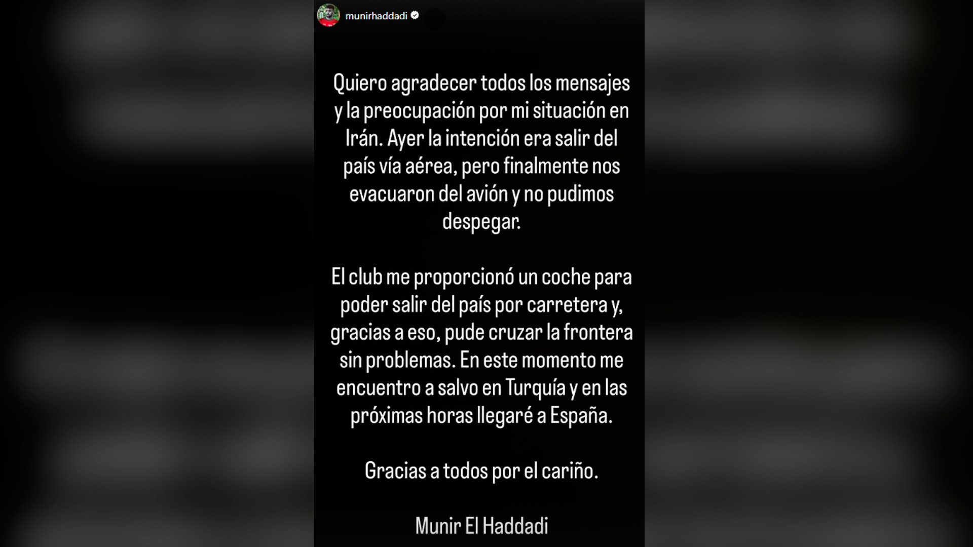 Munir El Haddadi, futbolista hispano-marroquí del Esteghlal iraní, confirmó este domingo que se encuentra "a salvo" en Turquía tras abandonar el país persa por carretera. El jugador, que no pudo tomar un vuelo ayer sábado cuando se encontraba en el aeropuerto de Teherán, consiguió abandonar el país gracias a un coche proporcionado por su propio club. Como confirmó, su intención es llegar a España "en las próximas horas". "El club me proporcionó un coche para poder salir del país por carretera y, gracias a eso, pude cruzar la frontera sin problemas. En este momento me encuentro a salvo en Turquía y en las próximas horas llegaré a España", explicó el jugador a través de su cuenta de Instagram. Su compañero de equipo, el guardameta español Antonio Adán ya afirmó ayer en una entrevista que él pudo salir de Irán al tomar uno de los últimos vuelos antes de que se decretase el cierre del espacio aéreo. Asimismo, relató que Munir, y el también español Iván Sánchez, jugador del Sepahan, no pudieron salir del aeropuerto cuando se disponían a viajar con destino Dubái. Ante las muestras de preocupación y cariño, el hispano-marroquí agradeció los mensajes de apoyo: "Quiero agradecer todos los mensajes y la preocupación por mi situación en Irán. Ayer la intención era salir del país vía aérea, pero finalmente nos evacuaron del avión y no pudimos despegar".