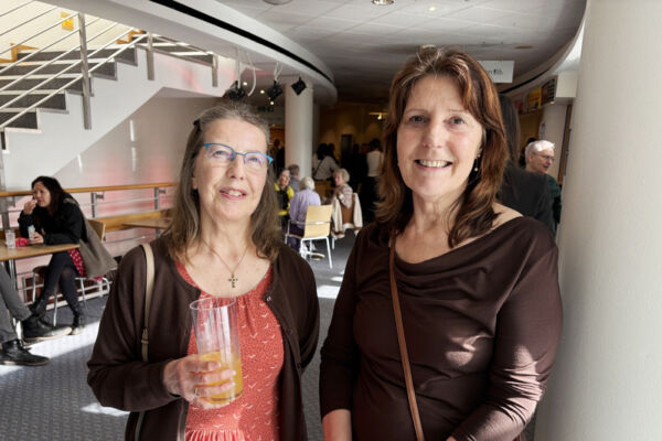 2026年3月1日下午,心理学家Jane Smith(右)和姊姊Ruth Novak一同观看了神韵环球艺术团在英国海威科姆-威科姆天鹅剧院(Wycombe Swan Theatre)的第九场演出。(李明/大纪元)