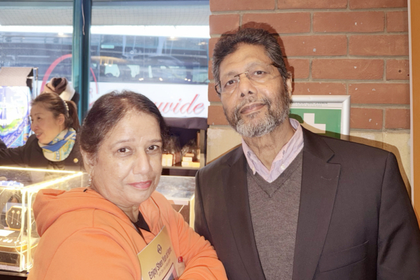 2026年3月1日下午,养老院经理Judith Agnew(左)和Edwin Ben观看了神韵环球艺术团在英国海威科姆-威科姆天鹅剧院(Wycombe Swan Theatre)的第九场也是最后一场演出。(James Xu/大纪元)