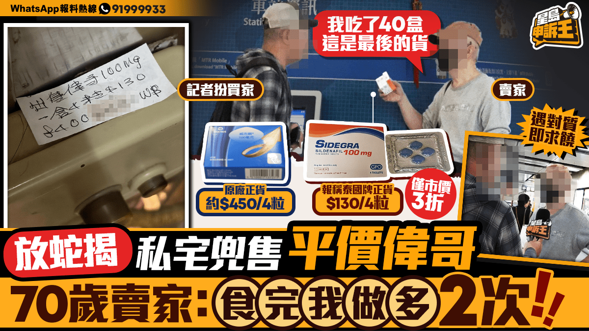 《星島申訴王》近日收到觀眾報料,指在銅鑼灣一楝私人樓宇門口,看到一張廣告紙,公然寫了「出售偉哥」(壯陽藥物威而鋼) 。廣告紙上講明出售的是100毫克「偉哥」,一盒4粒,每盒130元。相比正貨市價,平均400至500元一盒,大概等於3折。然而這種藥物,一般需要醫生簽發才能買到,如此公然兜售實屬罕見,亦屬違法。 賣家聲稱有效8小時 記者透過廣告上的WhatsApp號碼聯絡賣家,假意說想買藥,相約同日在