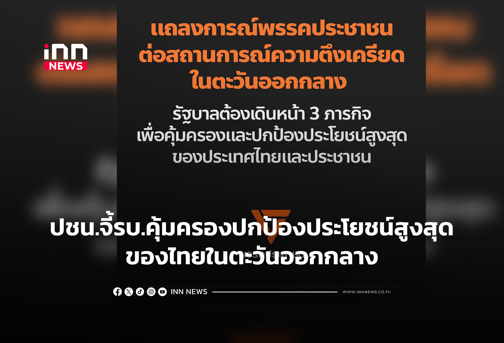 พรรคประชาชนออกแถลงการณ์ความตึงเครียดในตะวันออกกลาง แนะรัฐบาลต้องเดินหน้า 3 ภารกิจเพื่อคุ้มครองปกป้องประโยชน์สูงสุดของประเทศไทยและประชาชน จับมืออาเซียน-ประเทศมหาอำนาจระดับกลางเรียกร้องหยุดยิง หนุนกลไกเจรจา