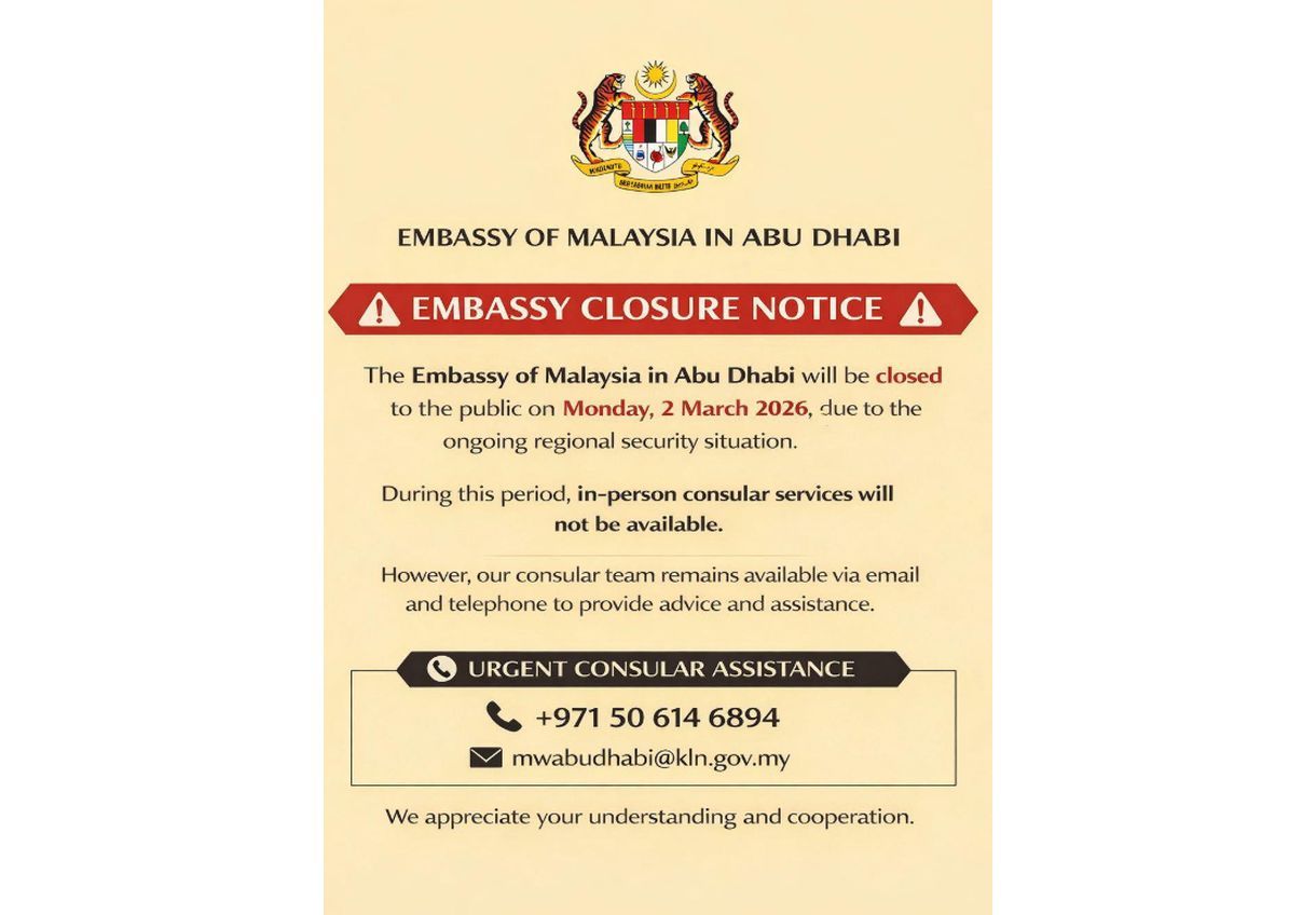PETALING JAYA: The Malaysian Embassy in Abu Dhabi, United Arab Emirates, will close to the public due to the ongoing regional security situation. Read full story