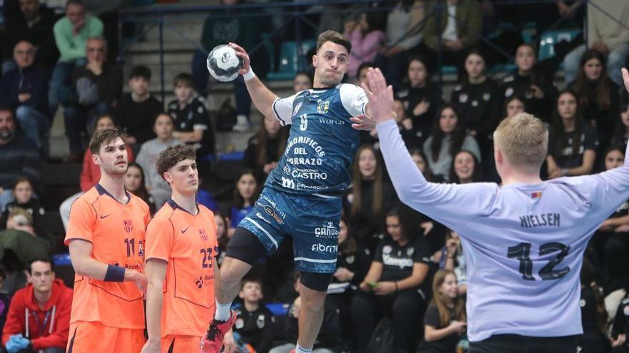 El peso de la lógica, ese que en balonmano se traduce como que la Liga Nexus Asobal es una competición que disputan 16 equipos y que gana el Barcelona por aplastamiento, se materializó ayer en O Gatañal. La metafórica visita al dentista que supone enfrentarse al conjunto blaugrana acabó con derrota del Frigoríficos del Morrazo (22-35) en un encuentro en el que Quique Domínguez reservó a varias de sus piezas más importantes –Manu Pérez, Javi García y Pereiro no se vistieron, y Arnau lo hizo pero no jugó un solo minuto– y que difícilmente sirva para sacar demasiadas conclusiones. El Cangas compitió, sobrevivió al rodillo que aplicaron los de Antonio Carlos Ortega en la primera parte, y se soltó un tanto la presión en la segunda, cuando el marcador ya estaba sentenciado hacia los visitantes. La mente ya está puesta en la final del próximo fin de semana ante el Guadalajara.