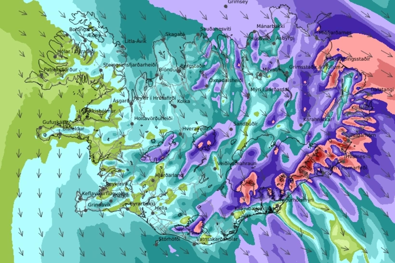 Appelsínugul viðvörun tekur gildi á Austurlandi að Glettingi og Austfjörðum klukkan 13 í dag en þar er spáð norðvestan 20-28 m/s með snjókomu og skafrenningi. Á þessum stöðum verður ekkert ferðaveður og er staðbundið foktjón mögulegt.