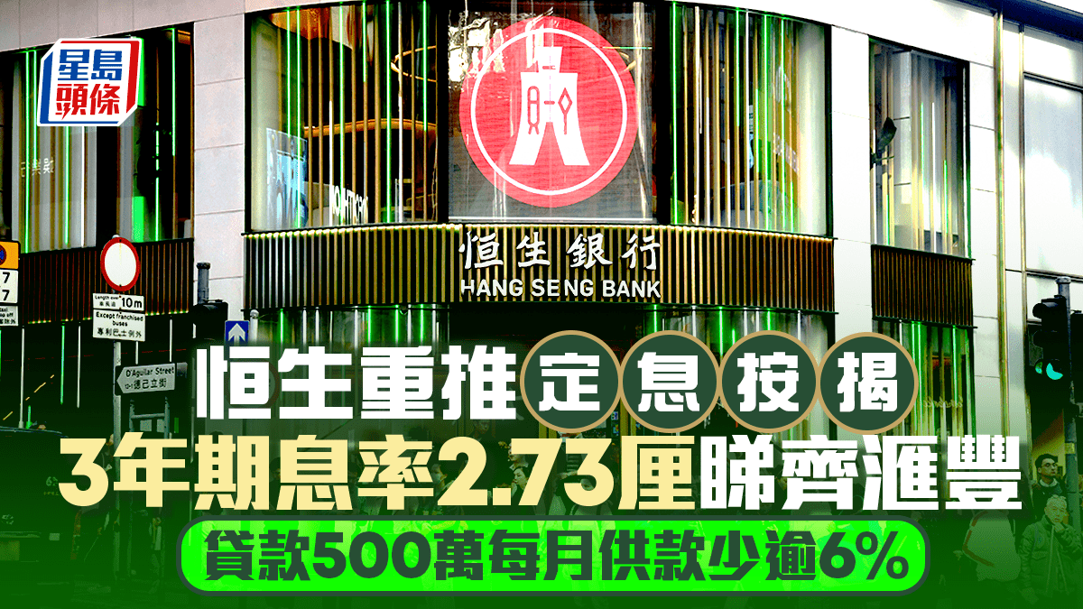 繼滙豐銀行去年推出低息定按計劃後,恒生銀行今天(2日)亦推出低息定按計劃,提供首3年定息期選擇,有別於滙豐有3年及5年期選擇;固定按息則同為2.73厘,低於H按主流封頂息(3.25厘)逾半厘;申請期於5月底截止,並需於今年內提取貸款,但比現有滙豐定按申請期至4月底更長。中原按揭董事總經理王美鳳認為,恒生將申請期延至5月底,相信是因為今年聯儲局主席任期於5月屆滿前,息率維持不變機會較大。 相關文章: