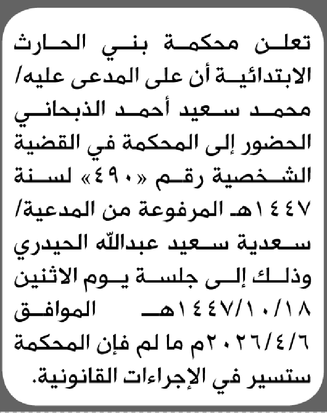 تعلن محكمة بني الحارث أن على المدعى عليه محمد الذبحاني الحضور إلى المحكمة