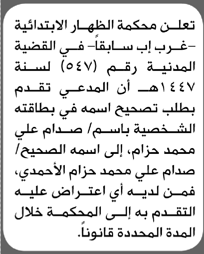 تعلن محكمة الظهار أن المدعي صدام علي حزام تقدم بطلب تصحيح اسمه