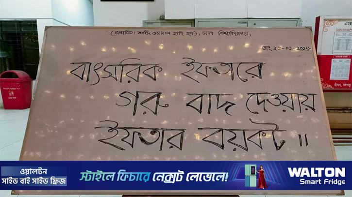 ঢাকা বিশ্ববিদ্যালযয়ে (ঢাবি) বার্ষিক ইফতার মাহফিলের মেনু থেকে গরুর মাংস বাদ দিয়ে মুরগির মাংস রাখার সিদ্ধান্তকে কেন্দ্র করে ক্ষোভ প্রকাশ করেছেন শিক্ষার্থীরা। এ সিদ্ধান্তের প্রতিবাদে বিভিন্ন হল সংসদ ইফতার বয়কটের ঘোষণা দিয়েছেন তারা।