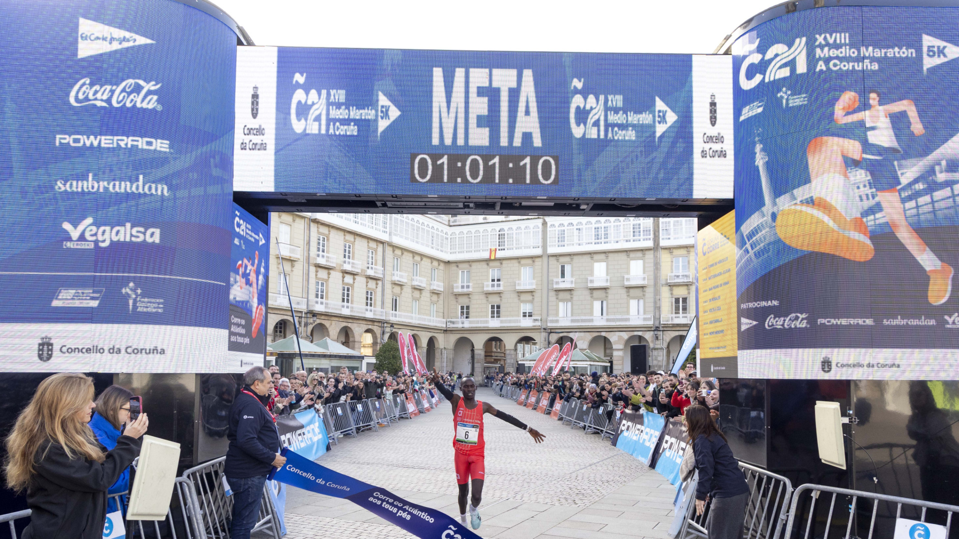 - Impresionante xornada deportiva a que se viviu esta mañá na cidade da Coruña, que na volta do medio maratón C21 ás rúas da cidade asistiu a un novo récord histórico da proba: os 01:01.12 do keniano Meshack Kipkurgat, gañador desta XVIII edición e que superou por 28 segundos a anterior plusmarca existente.O desenvolvemento do medio maratón, que arrincou ás 9.30 horas desde a avenida deMontoto, foi acompañado de boas condicións meteorolóxicas e dun ambiente festivo desdeo principio ata o final, na praza de María Pita, que por primeira vez na historia da C21 puxoa liña de meta á carreira.A ela chegou Kipkurgat seguido de preto polos atletas españoles Carlos Mayo e JesúsRamos, que deixaron o crono nos 01:02:43 e 01:03:11, respectivamente. Tras eles, okeniano Samson Kipyegon e o cambadés Amadeo Abal.Na categoría feminina, a vitoria foi para a venezolana Edymar Brea, que chegou á meta en01:13:55, coas galegas Ester Navarrete (01:14:18) e Sandra González (01:17:38) en segunda e terceira posición. Especialmente destacado foi o caso de González, atleta daEscola Atlética Lucense que debutou por primeira vez nun medio maratón e, aos seus 18anos, conseguiu bater o récord de España na categoría sub-20.Tras as tres ocupantes do podio feminino, a keniana Rono Cheptoo e a ferrolá Lucía Sicre. A alcaldesa, Inés Rey, acompañada polo concelleiro de Deportes, Manuel Vázquez, recibiuás e aos gañadores na liña de chegada, onde a rexedora lles fixo entrega da medallafinisher deste ano, inspirada precisamente na meta desta edición: a praza de María Pita.Rey e Vázquez deron os parabéns ás e aos vencedores desta edición, nun medio maratónque contou coa participación de máis de 2.600 deportistas.“Déronse as mellores condicións para que A Coruña disfrutase ao máximo desta xornada dedeporte ao aire libre. E iso foi posible tamén grazas aos servizos de organización, tanto dopersoal municipal como das entidades, clubes colaboradores e persoal voluntario. Cómpreagradecer sempre o seu traballo e implicación porque todas e todos son fundamentais paraasistir e axudar ás persoas participantes e ao conxunto da cidadanía en citas multitudinariascomo esta”, indicou Rey.