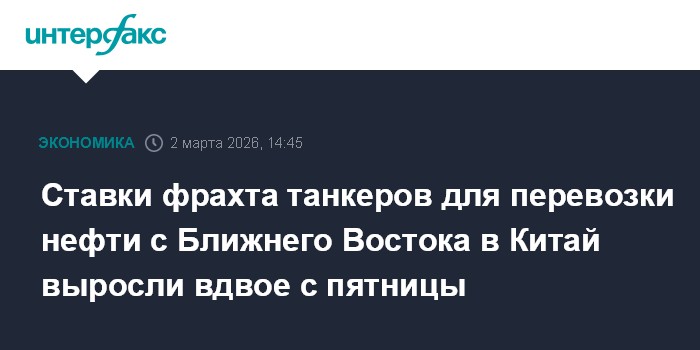 Ориентировочные ставки фрахта танкеров для перевозки нефти с Ближнего Востока в Китай выросли более чем вдвое с пятницы в связи с военными действиями в регионе, сообщает Bloomberg со ссылкой на судовых брокеров.