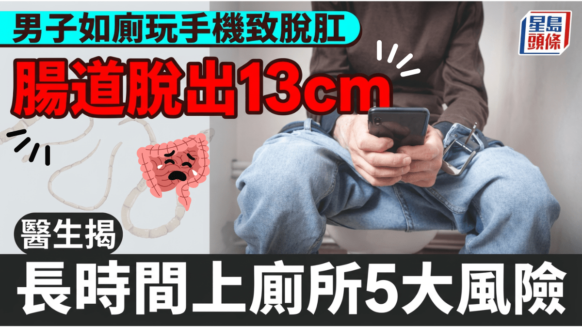 日常久坐傷身,長坐在馬桶同樣會帶來嚴重健康風險!內地一名男子長期上廁所時間超過2小時,因此引發腸道脫出13cm。有醫生估計,可能與他平日如廁時愛玩手機看影片有關。久坐在馬桶除了導致腸道脫出,還會帶來甚麼健康風險?哪些人出現脫肛的風險較大? 男子如廁玩手機致脫肛 腸道脫出13cm 根據內媒《健康河南》報道,該名33歲姓李男子,如廁時突然感覺到劇烈疼痛並出現便血症狀,更發現直腸脫出13cm,遂往醫院求