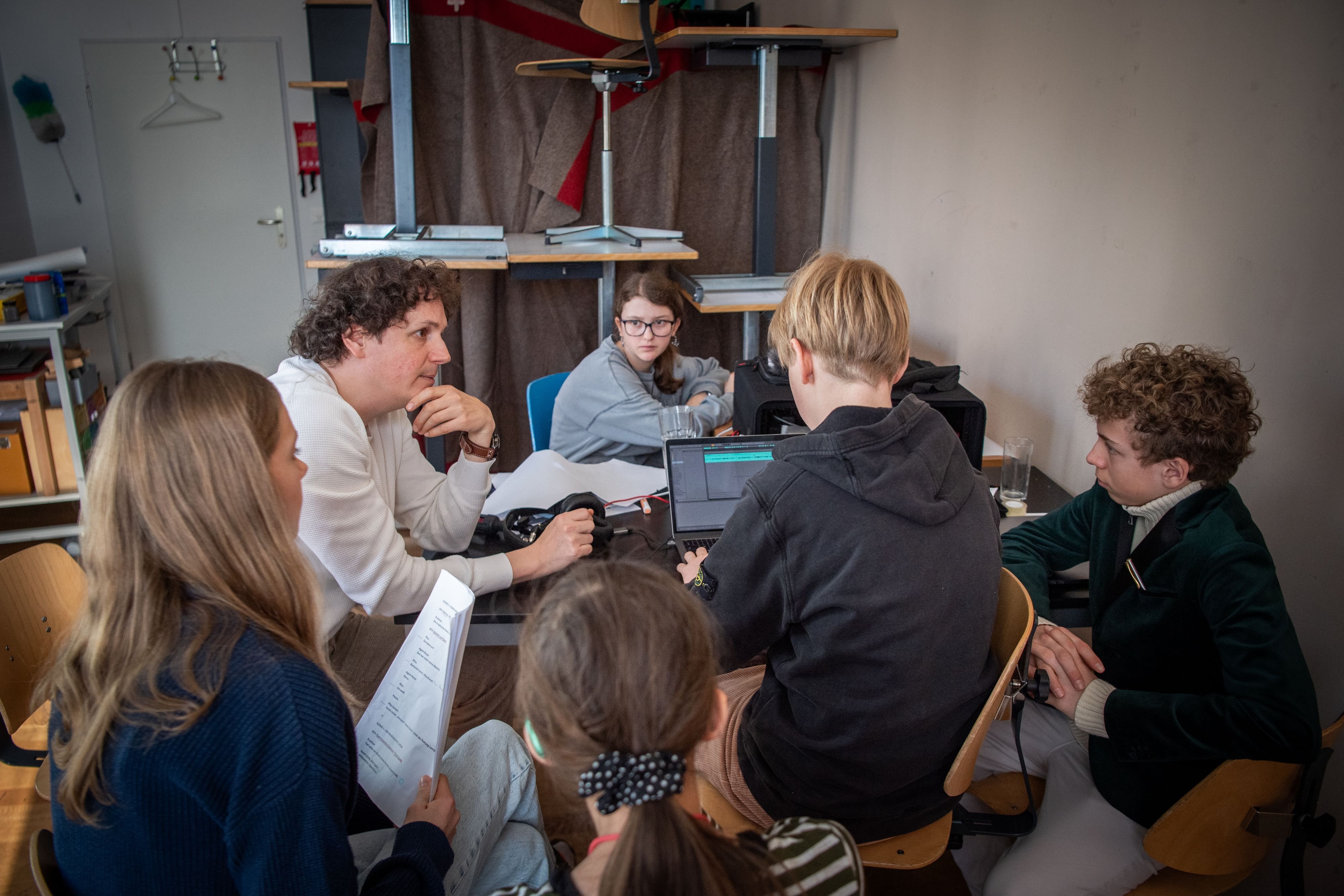 Stefan Bregys «Fahrendes Tonstudio» machte Halt an der Montessori-Schule Luzern. In Gruppen produzierten die Lernenden selbstständig ihre eigenen Hörspiele.