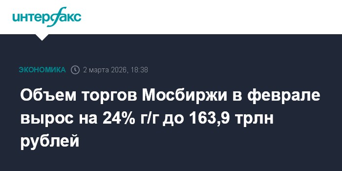 Совокупный объем торгов на рынках "Московской биржи" в феврале 2026 года увеличился по сравнению с февралем 2025 года на 24%, до 163,9 трлн рублей со 132,5 трлн рублей, сообщается в пресс-релизе биржи.