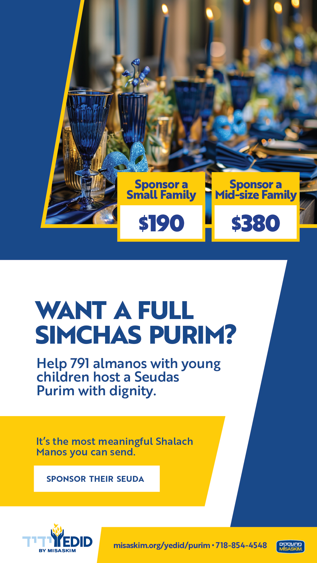 DONATE HERE!Misaskim & Yedid, Allow 791 Almanos – 3,852 Yesomim to Host Their Own Purim Seudah!! Sponsor their Seudah for ONLY $190!!! When Purim rolls around, the pain strikes deep for families who lost a parent. They wonder: Why celebrate when Totty is missing? And why do we need to be guests at someone else’s […]