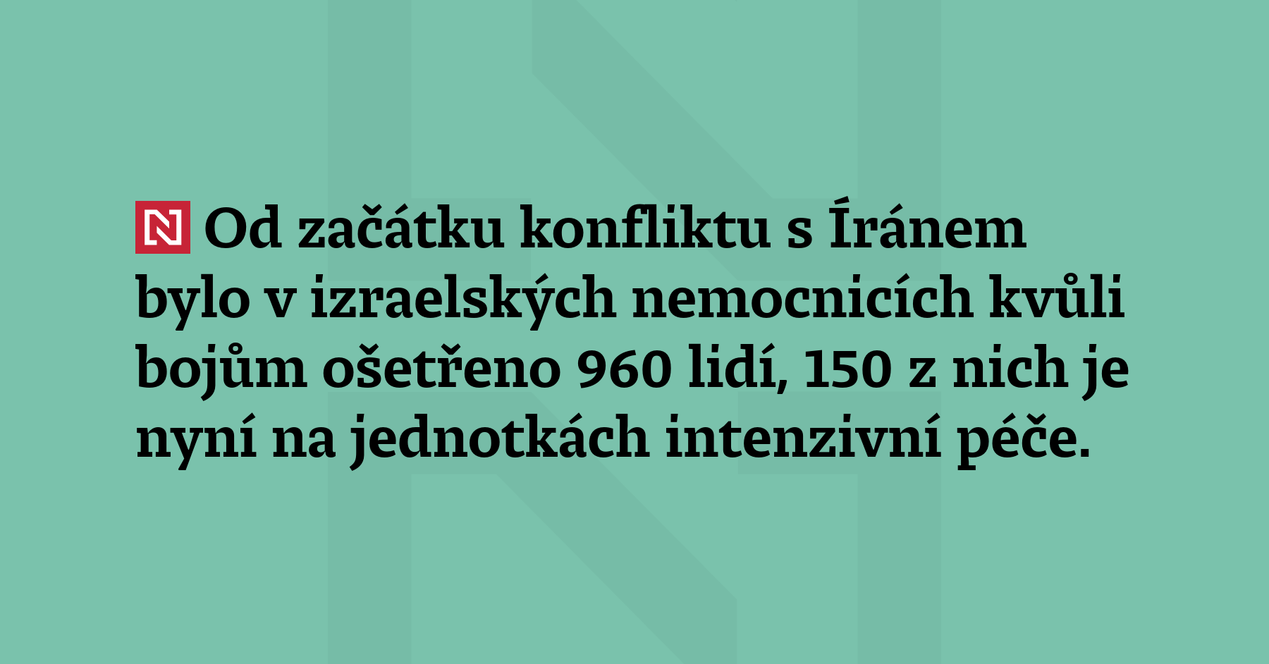 Od začátku konfliktu s Íránem bylo v izraelských nemocnicích kvůli bojům ošetřeno 960 lidí, 150 z nich je nyní na jednotkách intenzivní péče. (ČTK)