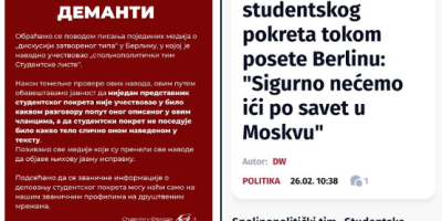 Studentski pokret "Studenti u blokadi" oglasio se zvaničnim demantom povodom pisanja Nova S o navodnoj "diskusiji zatvorenog tipa" u Berlinu, u kojoj je, prema tim tvrdnjama, učestvovao "spoljnopolitički tim Studentske liste".