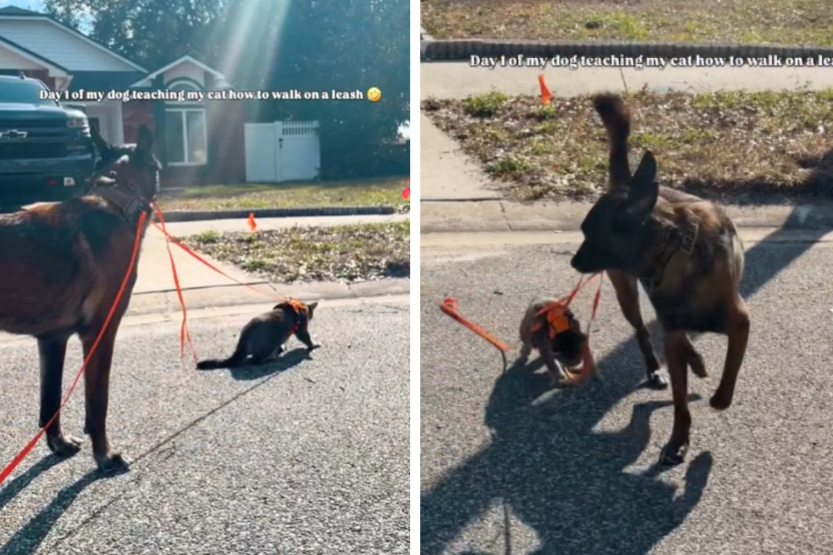 Frau führt Katze an der Leine, dann übernimmt ihr Hund das Ruder