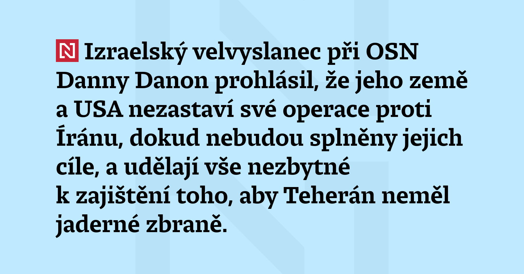 Izraelský velvyslanec při OSN Danny Danon prohlásil, že jeho země a USA nezastaví své operace proti Íránu, dokud nebudou splněny jejich cíle, a udělají vše nezbytné k zajištění toho, aby Teherán neměl jaderné zbraně. V rozhovoru s novináři v New Yorku Danon obvinil Írán ze „zoufalé vojenské reakce“ na to, co nazval „rozhodnými a chirurgickými“ americkými a izraelskými údery. Útok na Írán bude […]