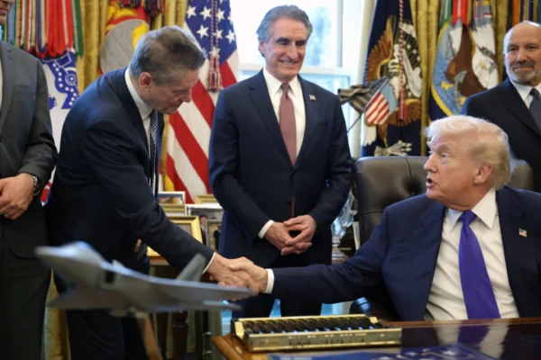 2026年2月2日,川普在华盛顿白宫椭圆形办公室宣布建立美国战略关键矿产储备时,与矿业金融家罗伯特‧弗里德兰(Robert Friedland)握手。(Alex Wong/Getty Images)