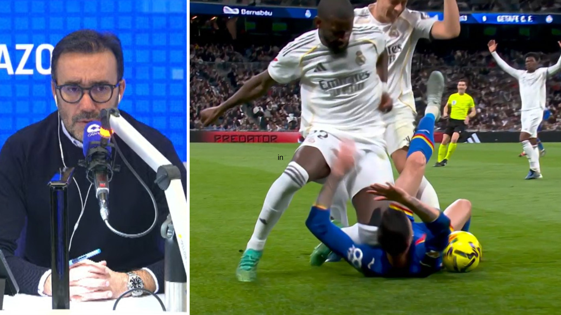 El partido entre el Real Madrid y el Getafe ha estado marcado por una de las acciones más polémicas de la jornada. Un doble rodillazo del central Antonio Rüdiger al lateral Diego Rico ha encendido el debate durante la retransmisión de Tiempo de Juego en COPE, con opiniones muy enfrentadas sobre la intencionalidad y la gravedad de la jugada. El encuentro comenzaba con novedades en ambos onces. En el Real Madrid, destacaba la primera titularidad del canterano de 18 años, Thiago Pitarch, en sustitución del lesionado Eduardo Camavinga, mientras que en el Getafe, José Bordalás daba entrada a Diego Rico en el lateral izquierdo y al uruguayo Sebastián Boselli en el centro de la zaga por las bajas de Abqar y Djené. El director de El Partidazo de COPE, Juanma Castaño, ha sido uno de los más contundentes al valorar la acción de Rüdiger sobre Diego Rico. Para el comunicador, la jugada va más allá de un lance del juego y la ha calificado como una de las más duras de la temporada. "Es una de las jugadas más salvajes que hemos visto este año", ha afirmado. Castaño ha discrepado frontalmente con el análisis del experto arbitral, Pedro Martín, cuestionando su interpretación. "Para mí es una agresión de varios partidos. No entiendo qué es lo que le falta por ver a Pedro Martín en el primer rodillazo para no ver que la intención de Rüdiger es darle un rodillazo en la cara al jugador del Getafe", ha sentenciado durante la retransmisión. Por su parte, el experto arbitral de Tiempo de Juego, Pedro Martín, ha ofrecido una visión diferente, aunque reconociendo la dureza inicial de la acción. Según su criterio, no hay motivo suficiente para una sanción mayor. "La primera sí que tenía mala intención, la segunda pone la rodilla donde puede y le vuelve a dar otra vez. No es para expulsar a un tío", ha explicado. La opinión de Martín ha sido respaldada por el exfutbolista Poli Rincón, que lo ha considerado una "acción de fútbol". Sin embargo, otras voces como la de Alfredo Relaño se han mostrado en desacuerdo, asegurando que era una jugada merecedora de revisión: "tiene que entrar el VAR".