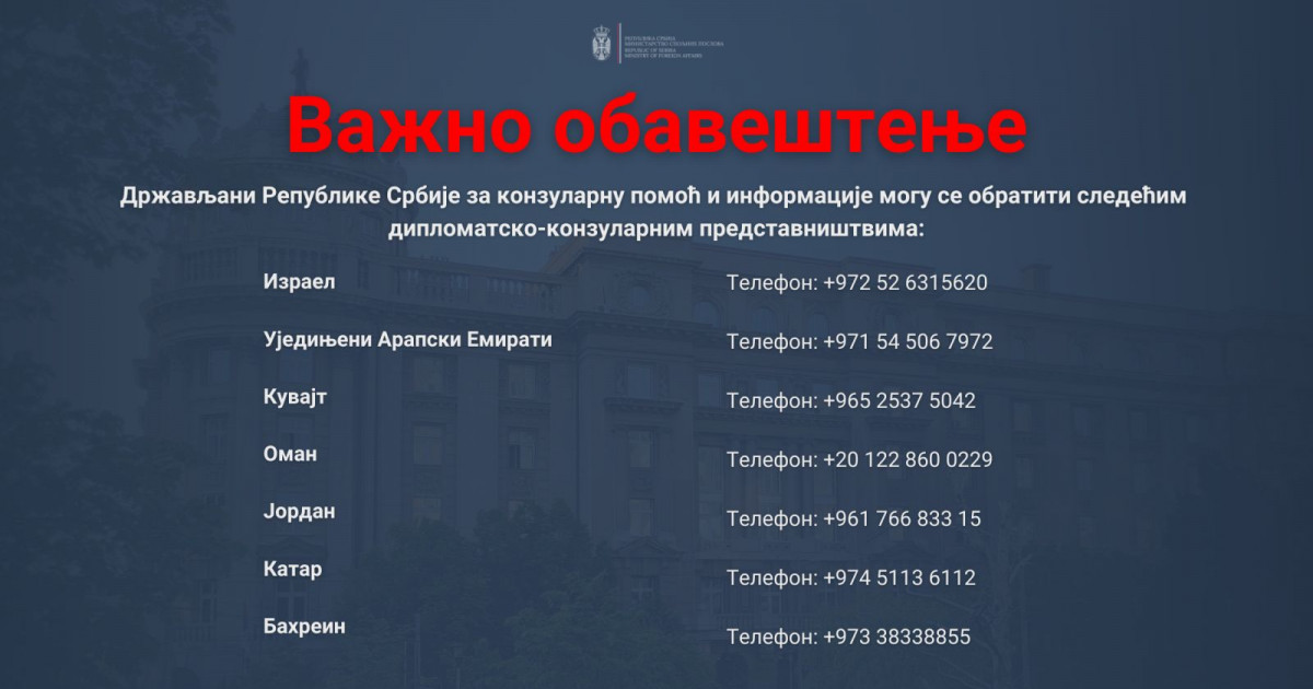 Ministarstvo spoljnih poslova Srbije objavilo je brojeve telefona na koja se mogu obratiti državljani Srbije u ratom pogođenim zonama na Bliskom istoku.
