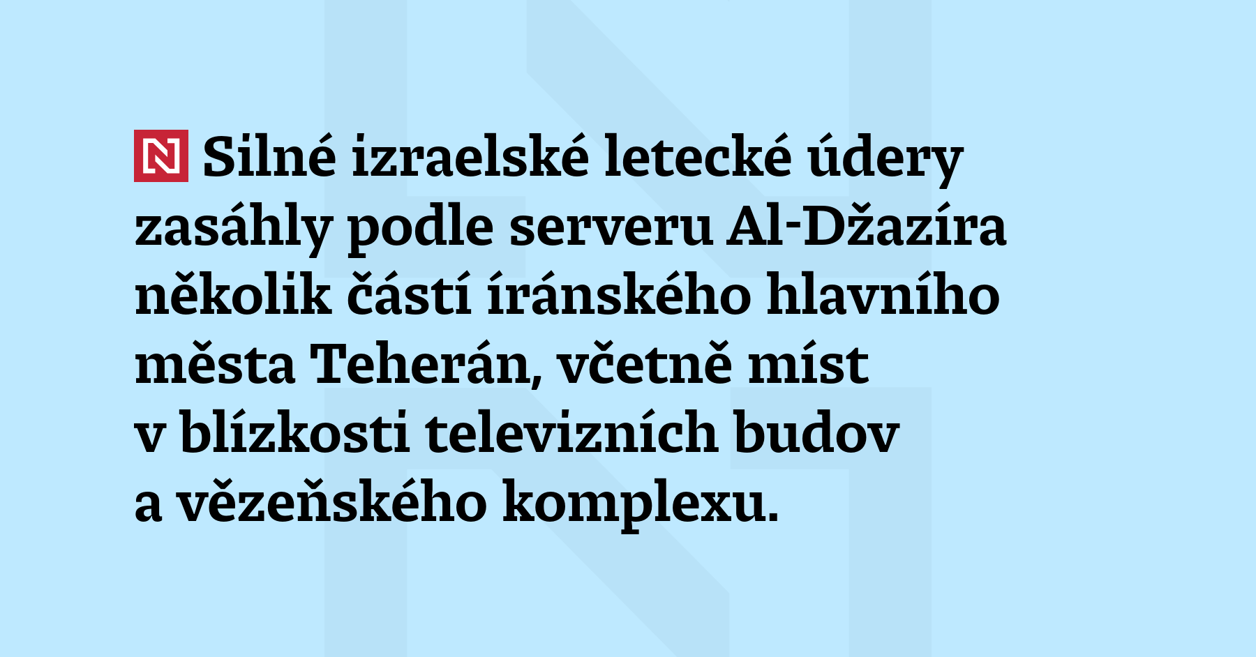 Silné izraelské letecké údery zasáhly podle serveru Al-Džazíra několik částí íránského hlavního města Teherán, včetně míst v blízkosti televizních budov a vězeňského komplexu. Po celém městě byly slyšet exploze. (Al-Džazíra)