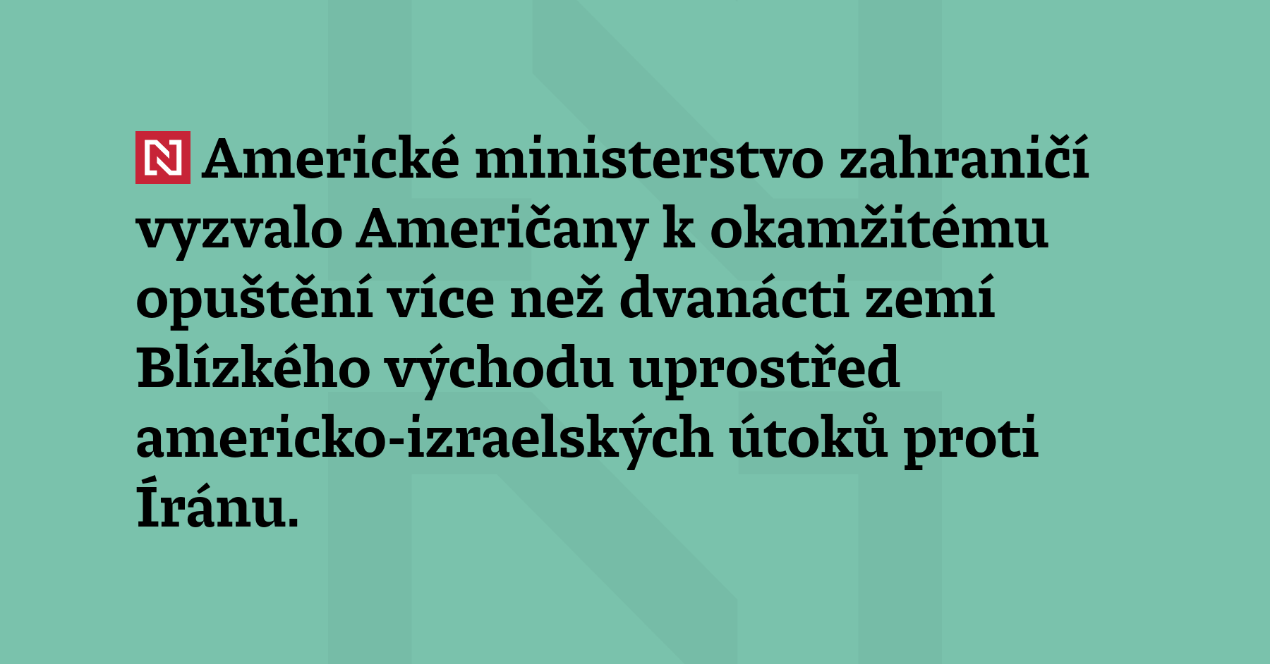 Americké ministerstvo zahraničí vyzvalo Američany k okamžitému opuštění více než dvanácti zemí Blízkého východu uprostřed americko-izraelských útoků proti Íránu. Američané byli vyzváni k odchodu z Bahrajnu, Egypta, Íránu, Iráku, Izraele, Západního břehu Jordánu a Gazy, Jordánska, Kuvajtu, Libanonu, Ománu, Kataru, Saúdské Arábie, Sýrie, Spojených arabských emirátů a Jemenu, sdělil náměstek ministra zahraničí pro konzulární záležitosti Mora Namdar. (Reuters)
