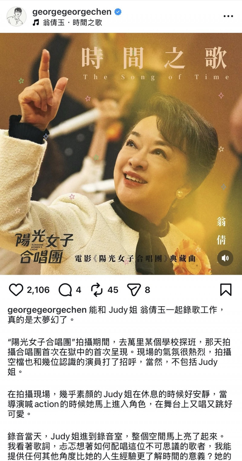 《陽光女子合唱團》賣破7億台幣,片中的靈魂人物「玉英奶奶」翁倩玉成了催淚擔當,她更親錄了片中插曲《時間之歌》,為電影配樂的知名音樂人陳建騏日前回憶和翁倩玉錄歌工作的點滴,感性表...…