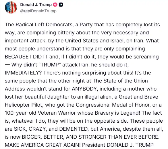 Trump: Demokratlar İran saldırılarını sadece ben yaptığım için eleştiriyor