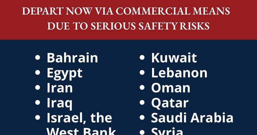 Norte-americanos devem abandonar o Bahrein, Kuwait, Egito, Líbano, Irão, Omã, Iraque, Qatar, Israel, Cisjordânia e Gaza, Arábia Saudita, Síria, Jordânia, Emirados Árabes Unidos e Iémen.