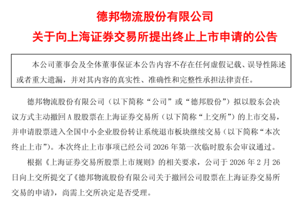 德邦物流股份有限公司发布了《关于向上海证券交易所提出终止上市申请的公告》。(公告截图)