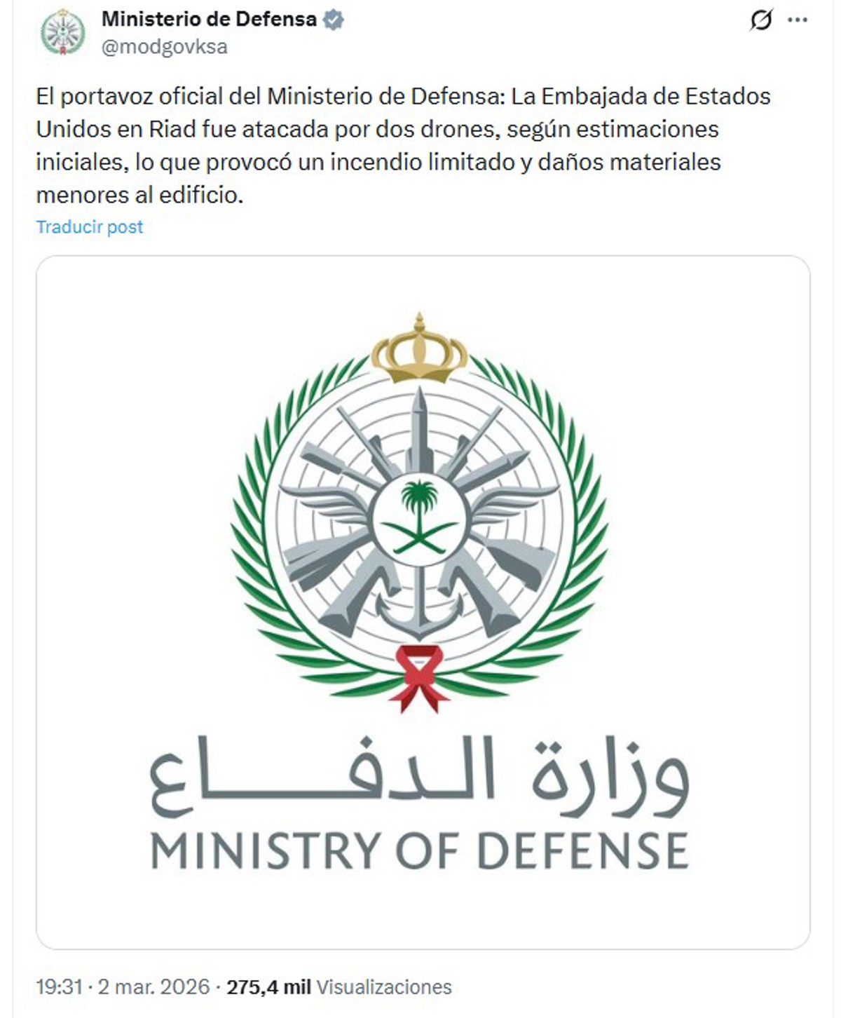 El Ministerio de Defensa de Arabia Saudí confirmó este lunes que la embajada de Estados Unidos en Riad fue atacada por dos drones, lo que ocasionó “pequeño incendio y daños materiales menores en el edificio”, sin que se informara de víctimas. La misión diplomática estadounidense en el reino saudí había emitido una alerta de seguridad […] The post Ministerio de Defensa de Arabia Saudí confirma ataque con drones contra la embajada de EE.UU. appeared first on La Hora .