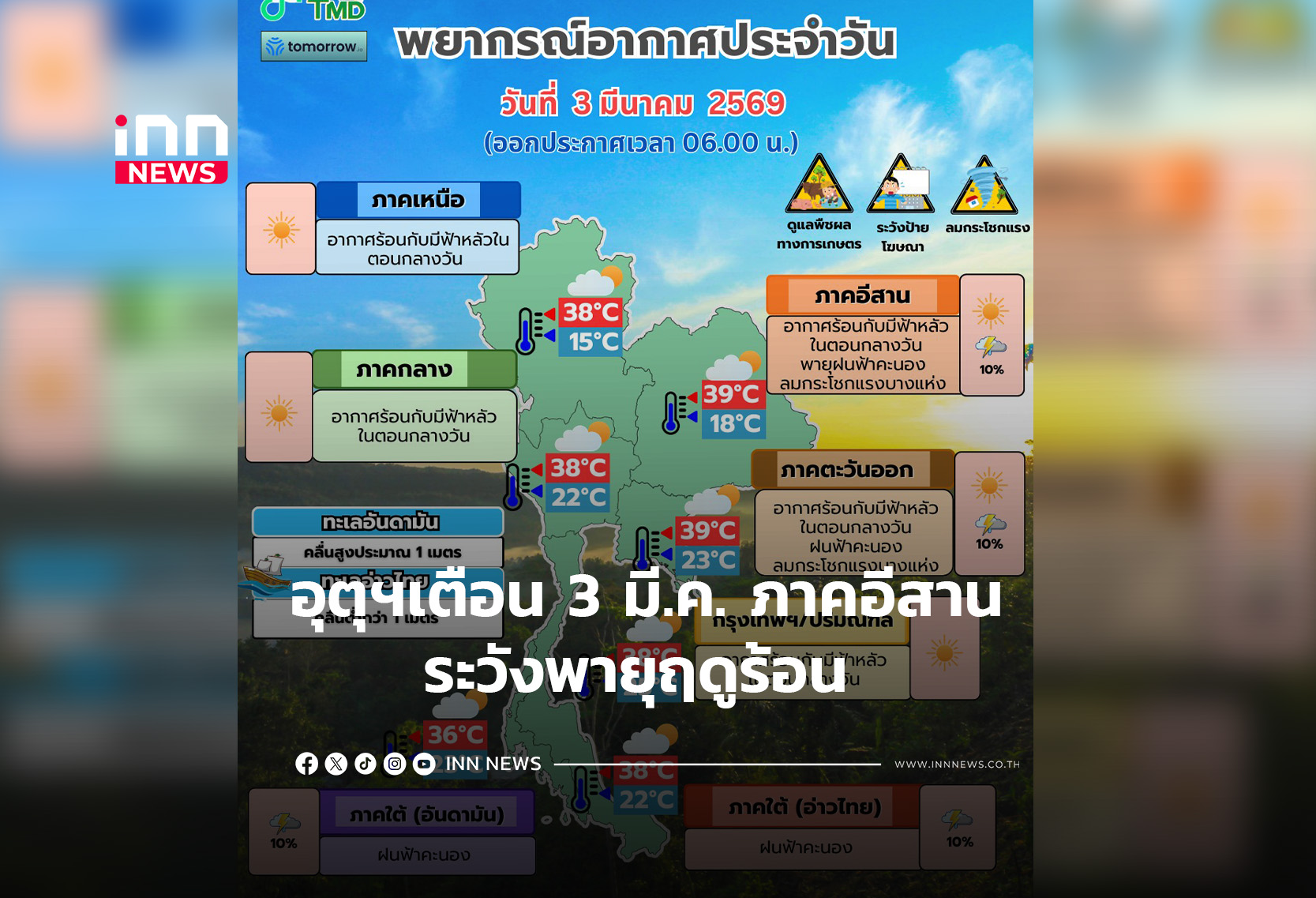 กรมอุตุฯ เตือน 3 มี.ค. ภาคอีสาน ระวังพายุฤดูร้อน ส่วนภาคใต้มี ฝนฟ้าคะนองบางแห่งทะเลคลื่น สูง 1- 2 เมตร